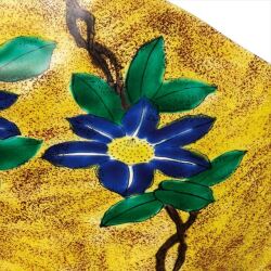 ●九谷焼製品の高台(ハマ)部分には釉薬が施してございません。この為、床の間、花台、棚、テーブル、漆仕上げなど塗装面の比較的柔らかく、傷の付きやすいものの上でお使いになる時には、必ず敷物をご使用くださいますようお願いいたします。